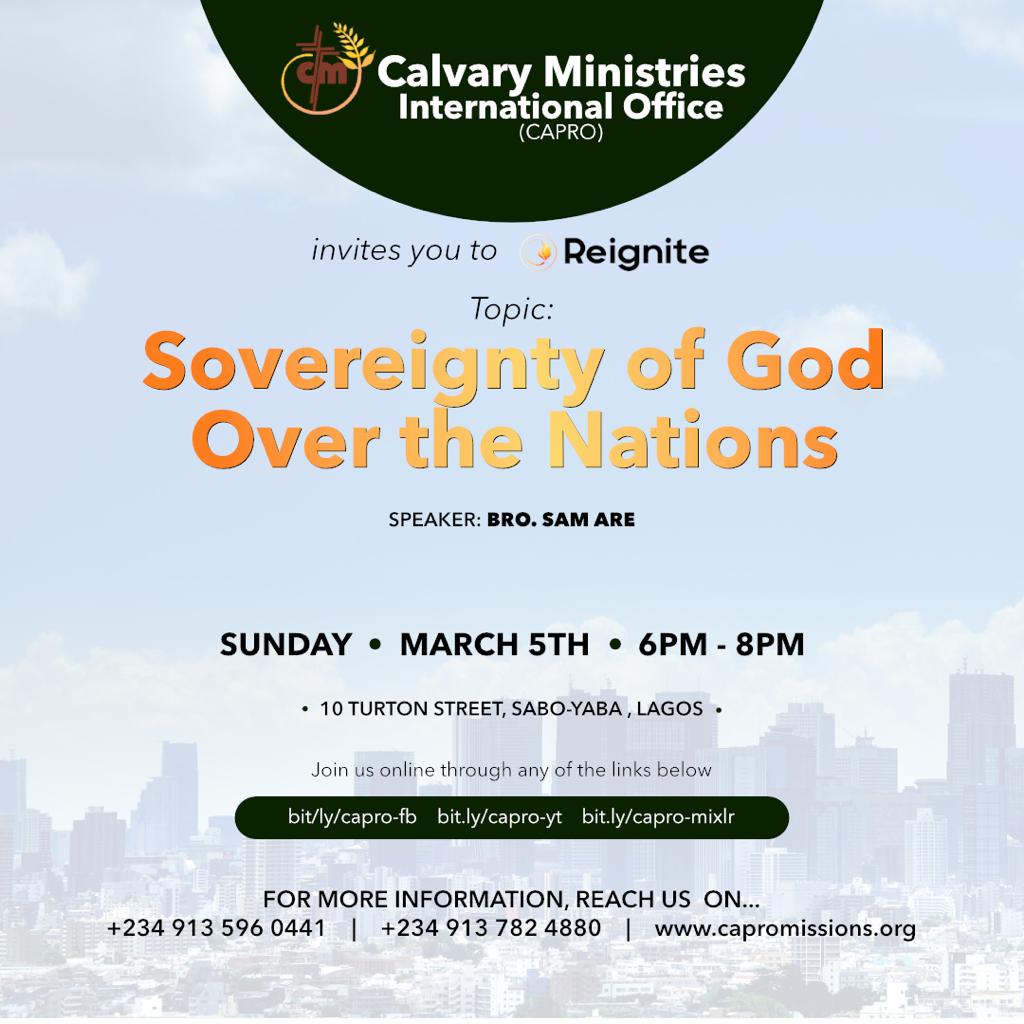 Please join us this sunday for REIGNITE , as our dear brother; Bro. Sam Are will share with us on “The Sovereignty of God’