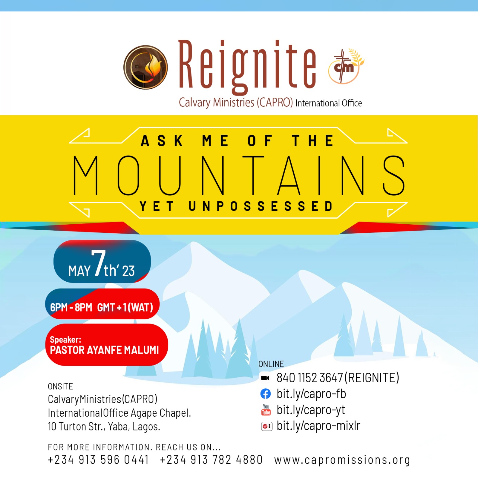 Give me this mountain ! was the cry of Caleb even at age 80. Brethren, there are unclaimed mountains all around us. This month’s reignite shall focus on the topic: Ask me of the Mountains yet unpossessed
